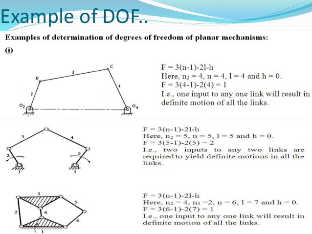 Basic Kinematics of Constrained Rigid Bodies Rapid Design through Virtual and Physical Prototyping Introduction to Mechanisms Yi Zhang with Stephannie Behrens 4 4.1 4.1. Shaking The Habitual The Knife Rar. 1 The degrees of freedom (DOF) of a rigid body is defined as the number of independent movements it has. Figure 4-1 shows a rigid body in a plane. To determine the DOF of this body we must consider how many distinct ways the bar can be moved. In a two dimensional plane such as this computer screen, there are 3 DOF. The bar can be translated along the x axis, translated along the y axis, and rotated about its centroid. Figure 4-1 Degrees of freedom of a rigid body in a plane 4.1.2 An unrestrained rigid body in space has six degrees of freedom: three translating motions along the x, y and z axes and three rotary motions around the x, y and z axes respectively.